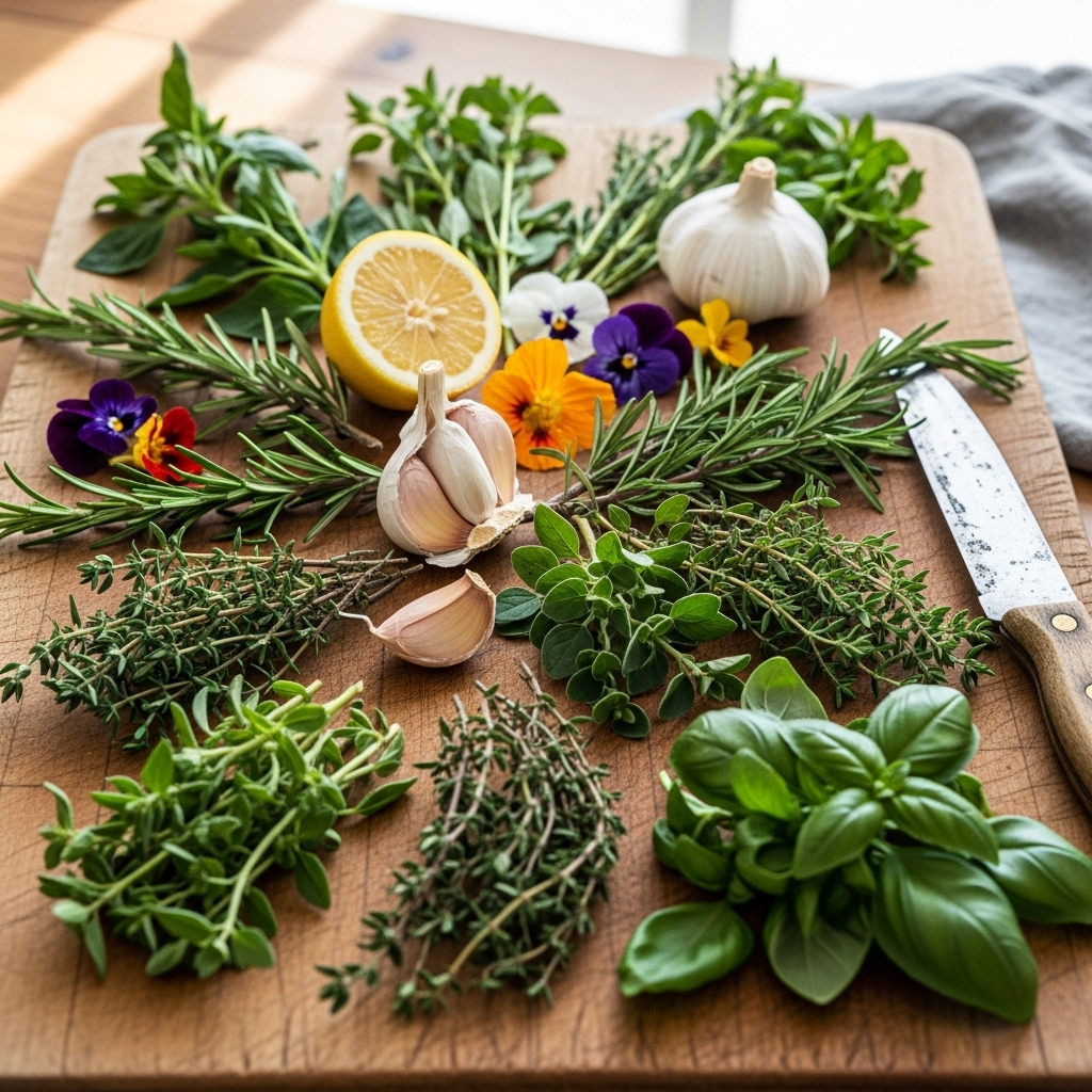 • **Thyme:** Woody, lemony notes. Ideal for marinades, roasted potatoes, or infusing olive oil.